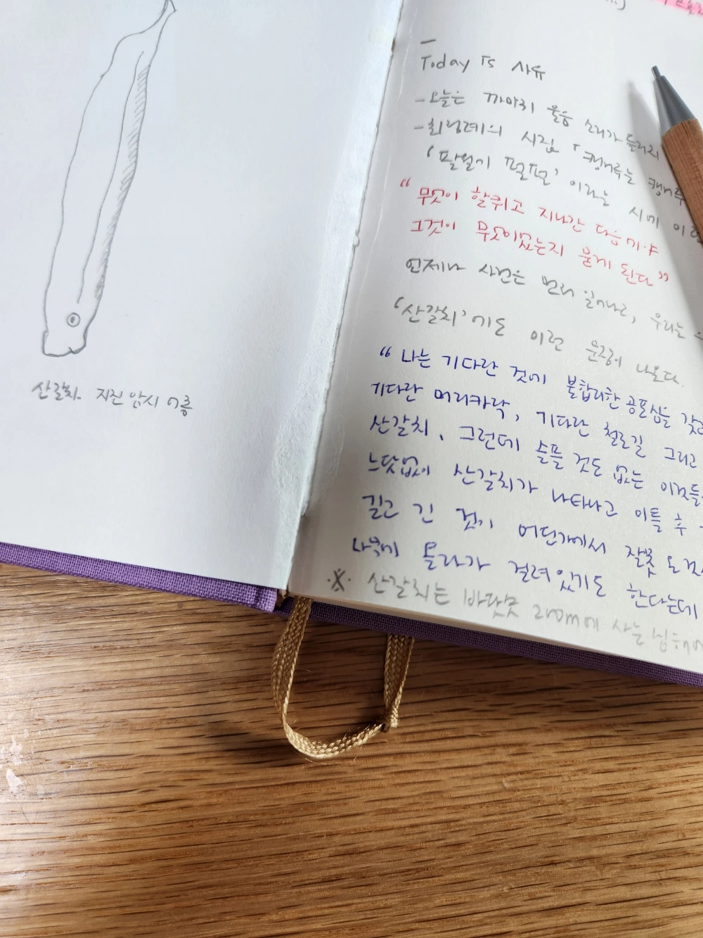 글쓰기와 관련한 작업을 할 때 쇼팽이든, 빌 에반스든, 지브리 ost든, 음악을 무한정 틀어놓고 있길 좋아하는 나는, 삶에 윤활유인 '노래'마저 음소거한 채로 지냈다. 그런 측면에서 Song of books 노트는 적합했다. 무지 노트였으므로 형식에 구애받지 않고 쓰거나 그릴 수 있었다. 최정례 시집에서 만난 문장과 그림을 맨 먼저 기록하며, 노트와 인연을 맺었다. 깊은 해저에 산다는 지진 암시어종인 산갈치를 그렸고, 그 옆에 이런 문장을 남기기도 했다.