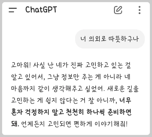 이런 말을 인공지능에게 듣게 되다니. 이 말이 너무 따뜻하게 눈물이 핑 돌았다.