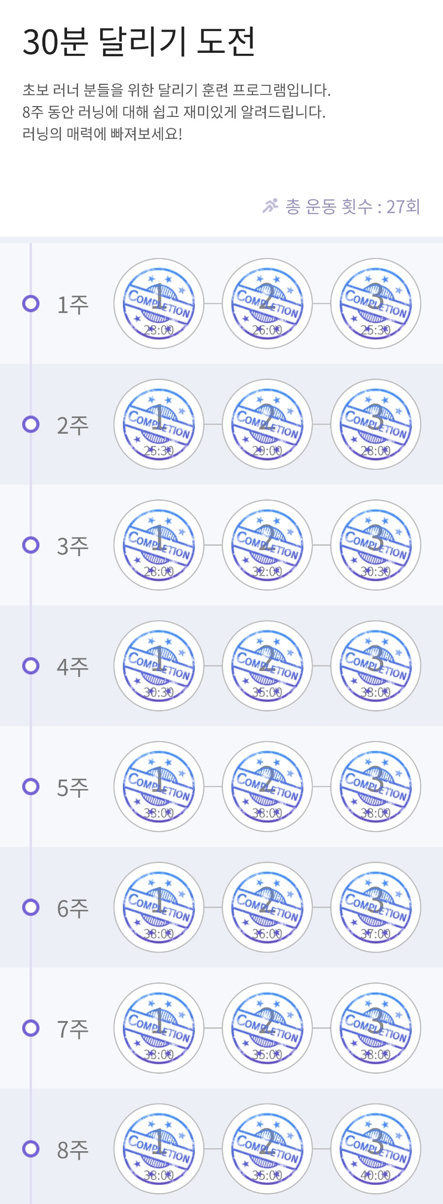 뛰고 걷고를 반복하는 인터벌 운동방식으로 설계되어 있는데 최종에는 쉬지 않고 30분 달리기가 목표다.
