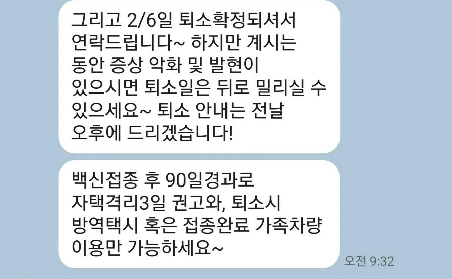 일요일 퇴소확정 연락을 받았다. 양성자확정통보 딱7일만이다.