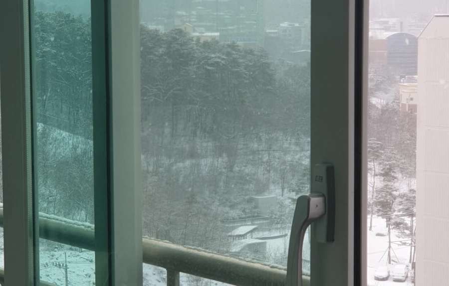벽가득 채운 먼지 낀 통창너머로 시골의 눈 쌓인 한적한 겨울풍경을 선사한다.