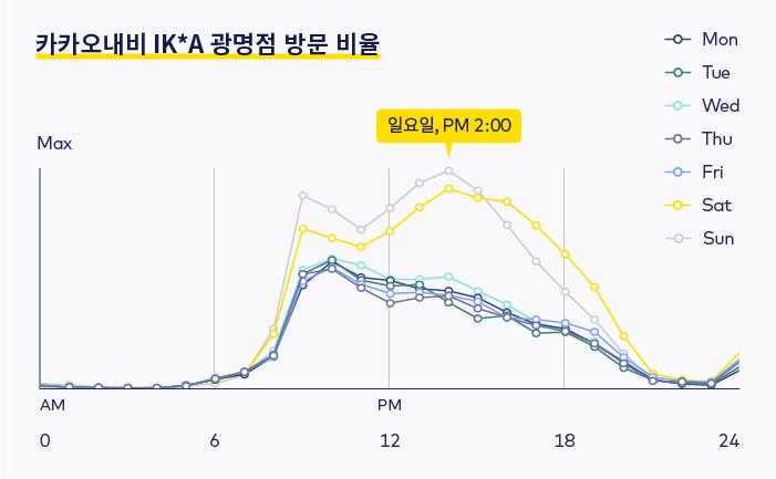 IK*A 광명점의 오픈 시간은 오전 10시. 위 그래프를 확인해보면 모든 요일 오전 10시에 방문 비율이 급증하는 것을 확인할 수 있다. 많은 사람들이 오픈 시간대에는 덜 붐빌 것이라 생각하기 때문이다. 그런 사람들의 심리가 겹쳐 오픈 시간대 IK*A 광명점은 생각보다 복잡하다. 평일이라도 오픈 시간대는 반드시 피하자.