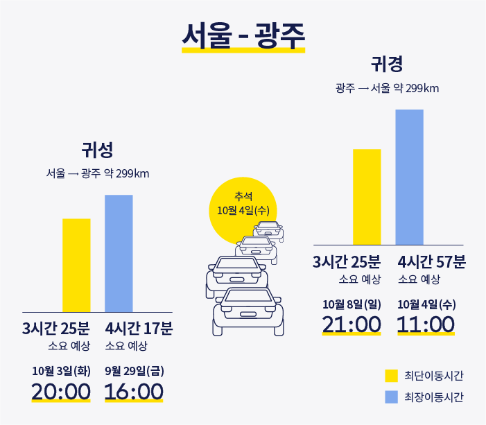 광주 역시 10월 3일 화요일 저녁에 출발하는 것이, 광주에서 서울로 돌아오는 귀경길은 다른 지역보다 더 늦은 10월 8일 일요일에 출발하는 것이 가장 수월할 것으로 예측된다.