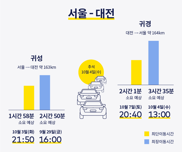 서울과 대전은 약 160km 정도의 거리다. 평소 2시간 4분 정도의 시간이 소요되는 서울-대전 간의 이동은 추석 당일 하루 전 3일 화요일 밤에 출발하면 평소와 비슷한 시간대에 갈 수 있을 것으로 전망된다. 귀경길 또한 7일 토요일 밤에 출발한다면 평소와 다름없는 시간대로 도착할 수 있을 것으로 전망된다. 귀성/귀경행렬이 본격적으로 시작되는 9월 29일 금요일과 10월 4일 수요일은 가급적이면 피하도록 하자.