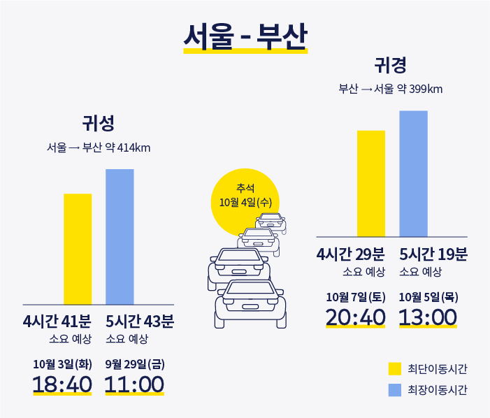 부산 역시 추석 당일 하루 전 출발을 추천한다. 하지만 출발시간은 대전과 대구보다는 조금 서둘러 출발해야 할 것으로 예측된다. 10월 3일 화요일 저녁 6시 40분에 출발하면 4시간 41분 정도 소요될 전망이다. 귀경길은 느긋하게 부산에서 시간을 보내다가 10월 7일 토요일 저녁에 출발하는 것이 수월할 것이다.