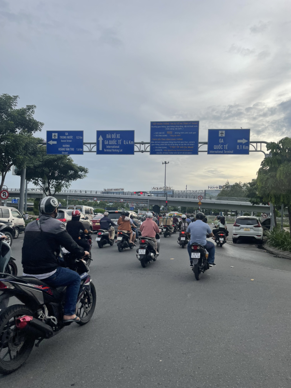 16시 40분, 자, 이제부터 나의 고행이 시작된다. 예약한 호텔은 공항으로부터 대략 2km 정도의 거리였고, 구글맵을 찍어보니 버스를 타는 게 32분, 걷는 게 26분 나왔다. 그냥 걷기로 한다. 대략 20kg의 짐을 메고, 습한 공기를 헤치며, 구글맵의 안내를 믿고 걷기 시작했다. 5분 정도 걸었나. 인도가 끊겼다. 서있던 이에게 맞은편으로 가는 길을 물어봤다. 그냥 가던 방향으로 길 따라가라고 한다. 그의 말대로 도로를 걸었다. 게이트를 나서니 차와 오토바이 무리가 쌩쌩 지나다니는 차도 위였다. 다시 돌아왔다. 그는 다시 같은 방향을 가리켰다. 안 되겠다 싶어 공항 방향으로 돌아갔다. 주차장 입구에서 만난 이에게 구글맵을 보여주며 물었다. "저 대각선 맞은편 길 같은데, 어떻게 내가 갈 수 있어?" 그가 대답한다. "일단 여기서 길을 건너고, 저쪽 길 따라 걸어가." 그의 손가락을 따라 눈으로 길을 찾아본다. 일단 여기는 4차선 도로다. "이 길을 건너라고?" 내가 물었다. 그는 웃으며 대답한다. "예쓰, 예쓰, 잇츠 베트남! 오케이, 오케이." 달리 방도가 없고 돌아갈 엄두가 나지 않던 나는 도로를 건너기 시작한다. 내가 맞은편에 도착할 때까지 그가 달려오던 차들을 정리해 줬다. 맞은편 길에 서서 뒤돌아 보았다. 그가 손을 흔들며 "고! 고!"를 외쳤다.