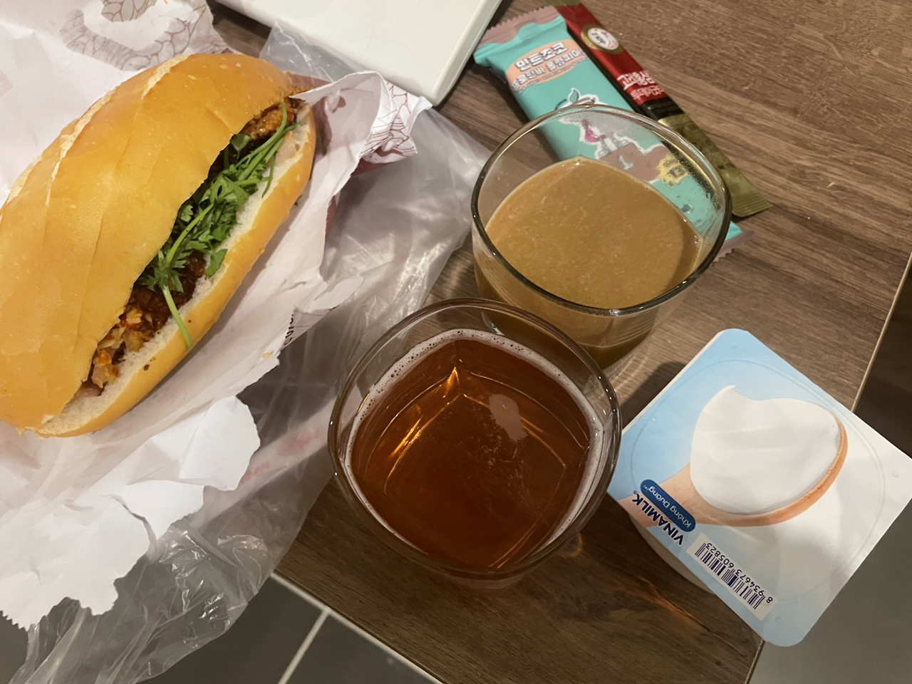 4시 반, 눈이 번쩍 뜨였다. 알람이 바로 울렸다. 이른 시간의 비행이고 빠르게 공항 이동을 위해 일찍 일어났다. 자기 전에 미리 가방을 싸 뒀기 때문에 충전기 등 꺼내 뒀던 짐만 마저 정리하고, 티팟에 물을 올려두고, 씻고, 옷을 입으면서 미리 사둔 반미를 먹었다. 빵은 아침까지 바삭했다. 배낭이 매우 무겁기 때문에 배가 고프면 2배로 힘들다는 걸 이미 경험했다. 아침은 꼭 챙겨 먹어야 한다.