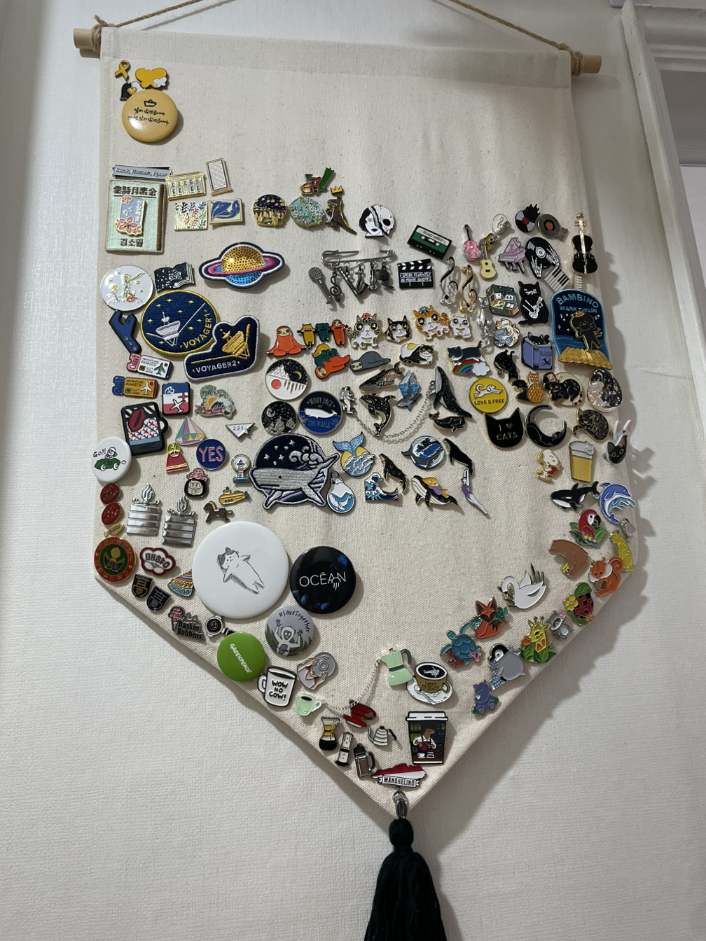 몇 년 전에 모든 뱃지를 꺼내 한곳에 모아 꽂았다. 지금도 벽에 걸려있는 뱃지 수집 포스터에는 다양한 종류의 뱃지들이 꽂혀있다. 꾸준히 사거나 받아왔으니 당연하겠지만, 후원을 하고 받은 뱃지, 어디선가 받은 브랜드 뱃지, 여행이나 전시에서 기념으로 사 온 뱃지, 어느 작품의 굿즈 등 다양하고 귀여운 뱃지가 잔뜩이다. 커피에 빠져 있을 때는 커피 관련 뱃지를 모았고, 특정 캐릭터나 고양이와 고래 뱃지도 많다. 거기다 그때그때 모아서 그런지 일관성도 없다. 왜 공군 뱃지까지 여태 가지고 있는지는 알 수 없는 일이다.