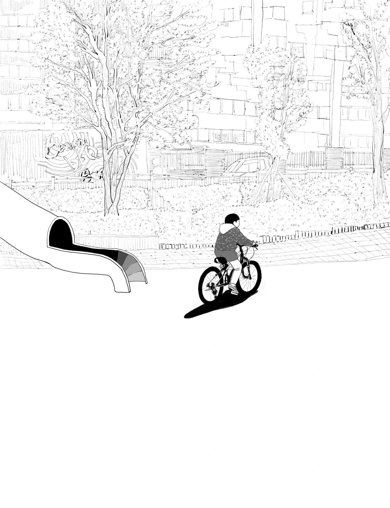 친구는 조용히 밤이가 타는 자전거를 코치마냥 바라보고있다. 자신의 몰랐던 능력을 발견했다며 기뻐하는 밤. 친구는 말한다. "조금만 더 타면 자유롭게 라이딩할 수 있을 거예요." 9살 친구의 호기로운 말이 귀여우면서 왠지 든든하다. 조만간 한 손으로도 탈 수 있을 거라며 자신이 지금 그렇게 탄다는깨알 자랑도 놓치지 않는다.