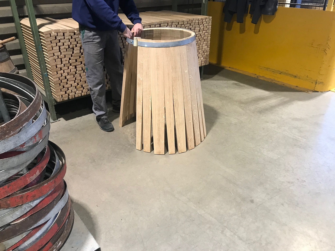 그렇게 건조된 참나무들은 오크통을 구성할 수 있는 크기로 가늘게 자른 후 위의 사진처럼 금속 링을 둘러 윗부분을 연결합니다. 왼쪽에 보시면 금속 링들이 쌓여 있죠? 녹슬고 페인트칠이 벗겨진 것으로 보이는 건 걱정하지 마세요. 오크통을 먼저 작업한 후 나중에 새 링으로 갈아 끼운답니다. :)