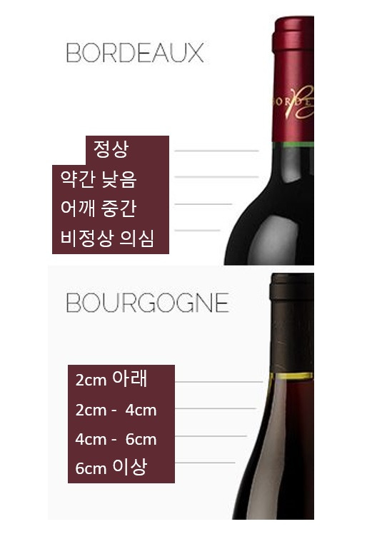 세워두었을 때, 와인병에 담긴 액체 높이가 다른 와인보다 좀 낮은 정도는 정상입니다. 그간 견뎌온 세월이 있으니까요. 다만 어깨까지 내려온 경우에는 불량을 의심해보세요. (아래 액체 높이 이미지 참조)