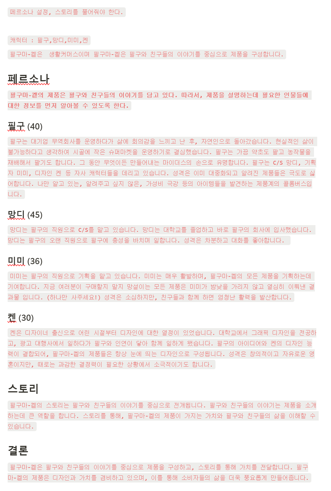 단순하지만 단순하지 않다. 각 캐릭터의 페르소나가 형성이 되있고 캐릭터를 활용한 웹툰 형식의 상세페이지를 제공함으로써 체류시간을 늘렸다. (실제로 스토어에 섹션당 체류시간은 1분 59초다)