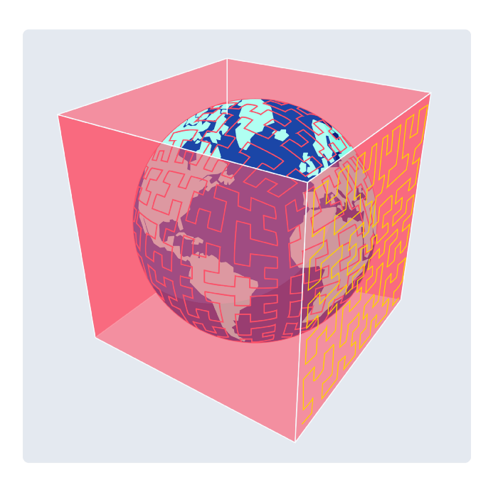 한번 지구의 중심에 빛이 있다고 생각해보자. 그 빛은 지구의 표면을 각 면이 Hilbert curve로 가득 찬 cube에 투영할 것이며, 각각의 가장 작은 cell은 지구의 작은 영역을 나타낼 것이다. 이 방법이 S2가 S2 cell을 mapping 하는 방법이다. 가장자리, 특히 모서리 부분에 있어서는 왜곡이 있다. 더 자세한 방법은 Google의 S2 slide에서 살펴보기 바란다.