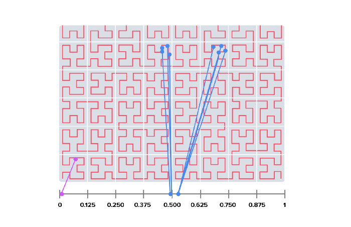 Geo Library들에 대한 많은 연구를 한 이후, 우리는 Google S2를 사용하기로 했다. S2는 Hibert curve를 기반으로 한다. Hilbert curve는 공간적 위치성을 보존하는 space-filling curve로, Hilbert curve 상에서 가까운 두 점은 물리적 공간에서도 가까이 위치해 있다. 각각의 가장 작은 Hilbert curve clone은 cell이라 불리며, 4개의 인접한 cell은 하나의 큰 cell을 구성하기 때문에, 이것은 quadtree structure를 지닌다고 할 수 있다.