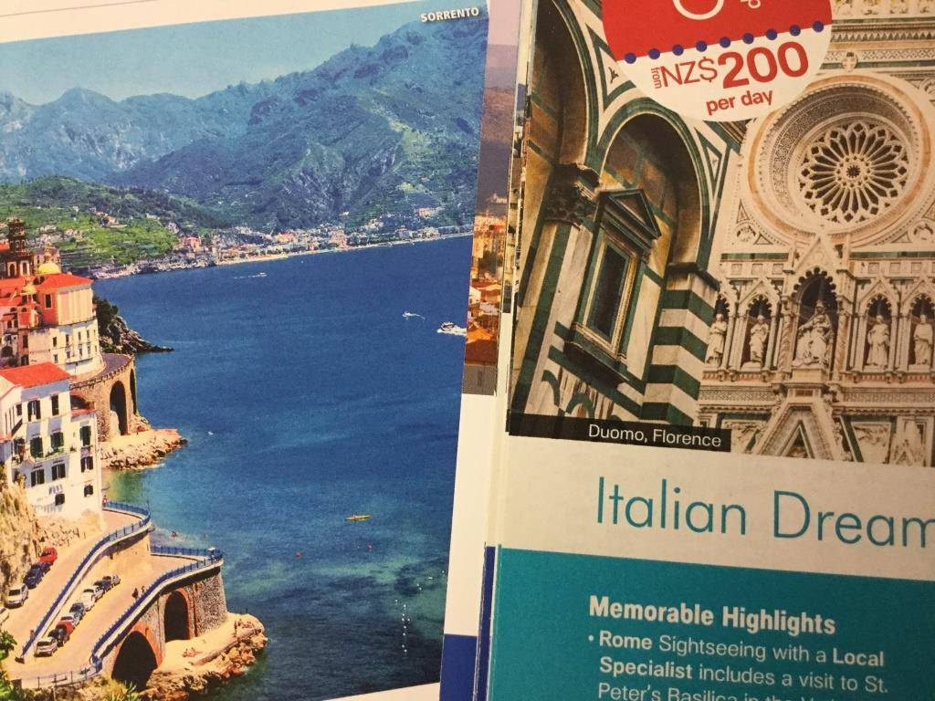 죽기 전에 꼭 가봐야 한다는 남부 이태리의 아말피 해변, 폼페이 유적을 볼 수 있다는 베수 비어스 산, 거대한 회색 지붕을 가진 중세의 성곽들, 엔리코 카루소의 사진 그리고 카프리섬으로 가는 배편 정보가 관광객들의 사진과 함께 나와 있었다.