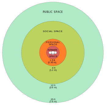 Social Space: 그 너머 직경 1.2m까지의 원형 공간이다. 직장 동료, 친구, 지인, 비즈니스 관계나 모임에서 새로 알게 된 각종 사교적 만남들이 이 영역 내에서 이루어진다.