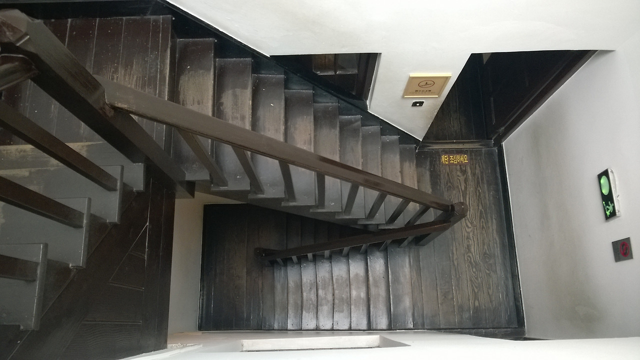 <전시장으로 올라가는 목조 계단. 이것이 주 통로이며 성인 남자 한 명이 겨우 오르내릴 정도로 좁다>
