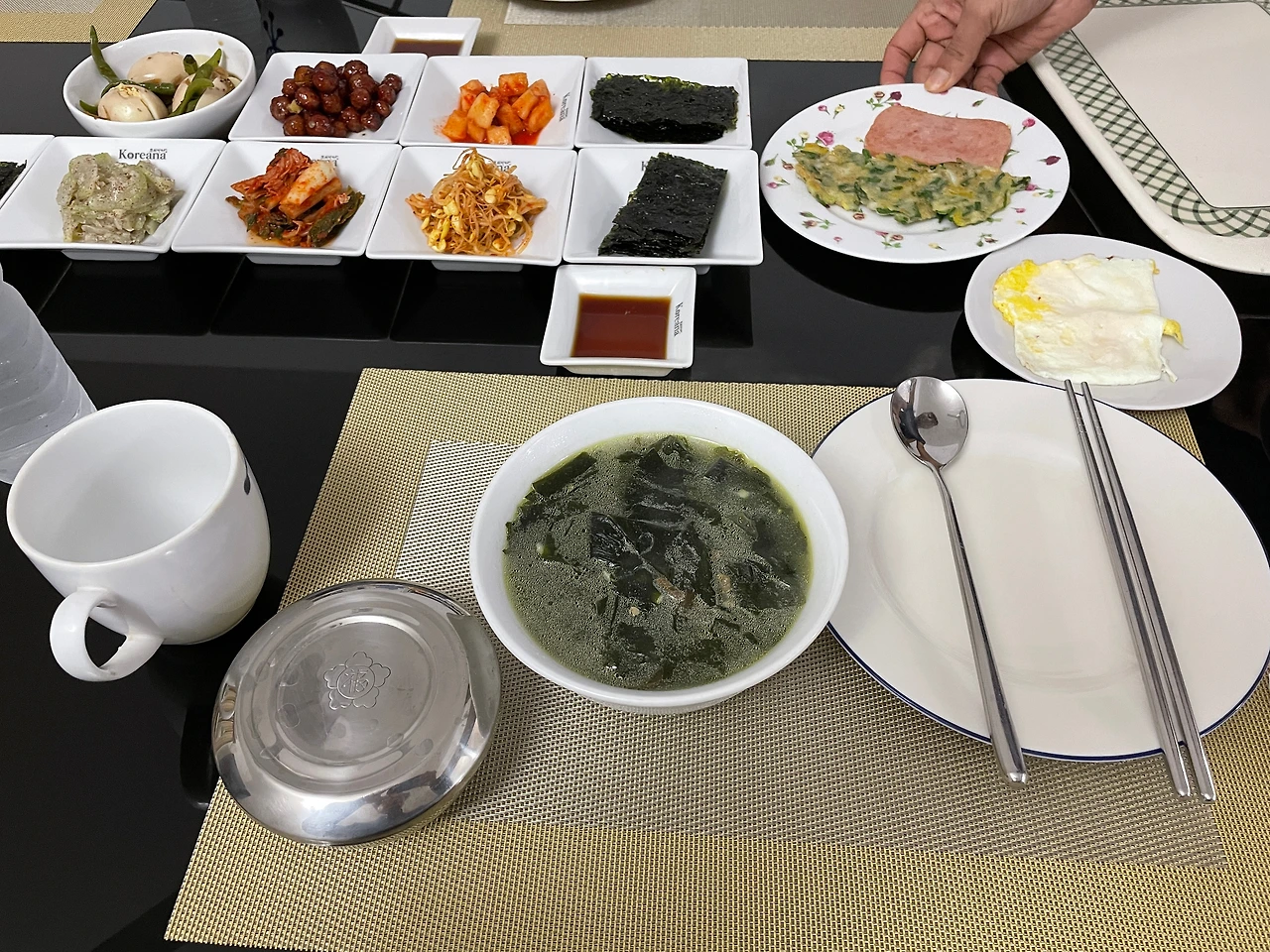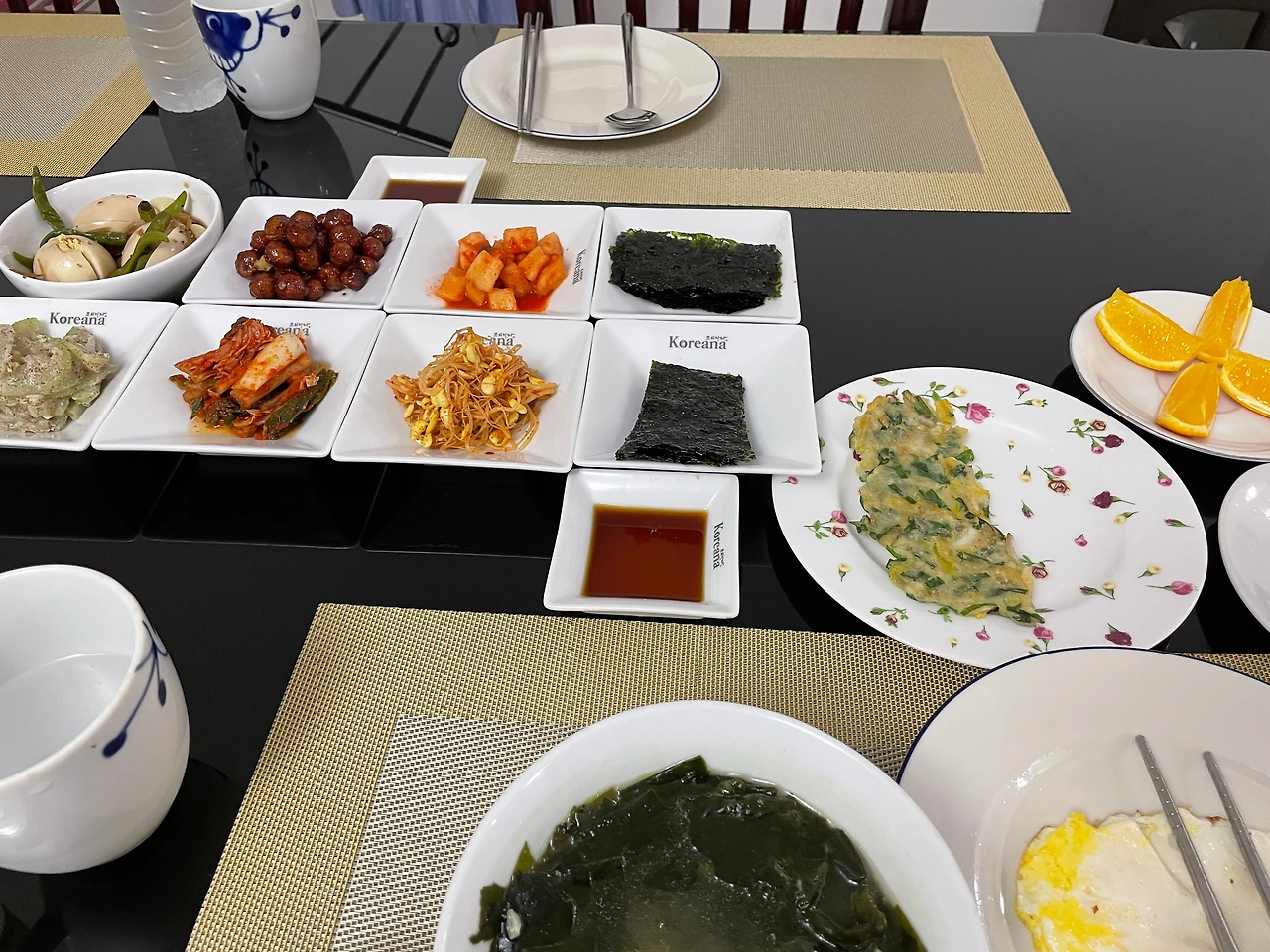 미역국, 진지, 계란조림, 깍두기, 김, 콩나물, 김치, berry, 무우조림, 전, 오렌지