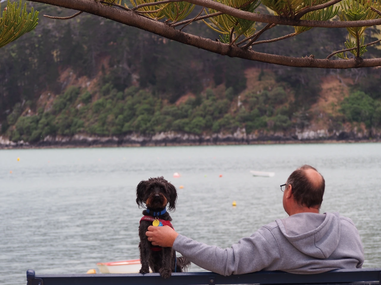 벤치에 여유롭게 앉아 앞만 보는 아저씨 와 우리만 쳐다보는 귀여운 개 도 있고