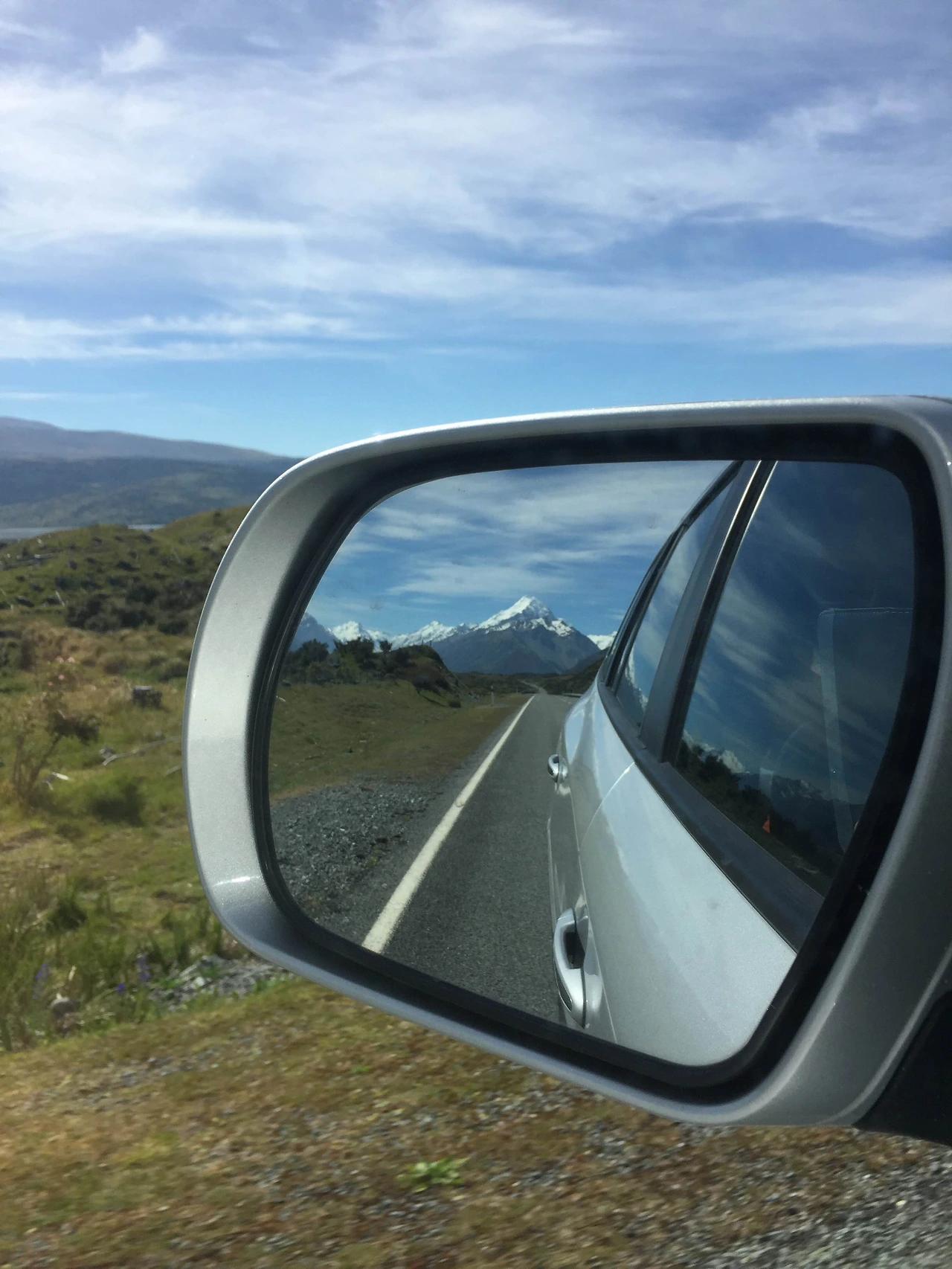 자동차 백미러로 갑자기 다시 나타난 그 산,