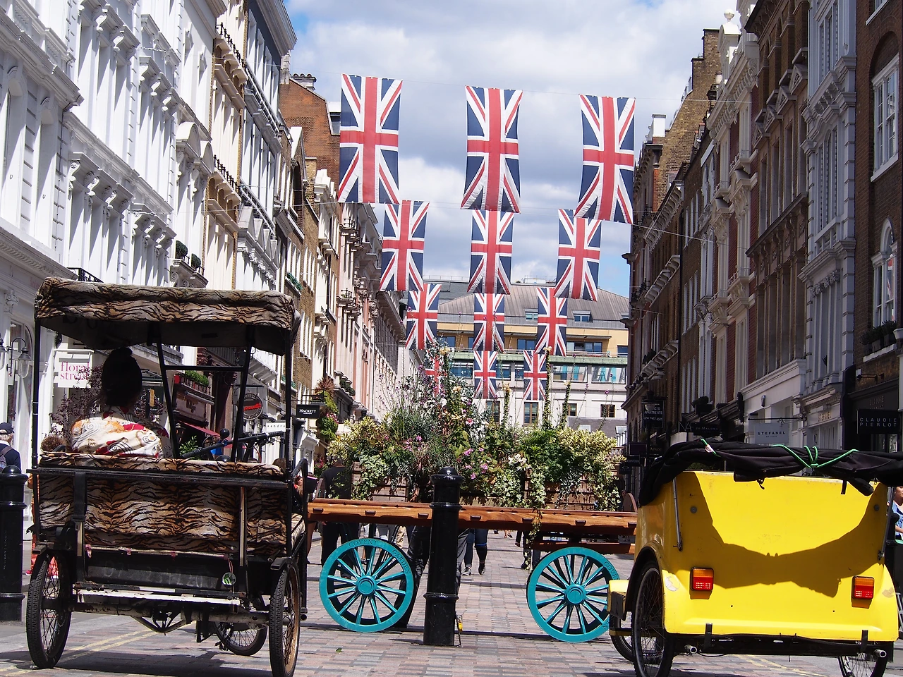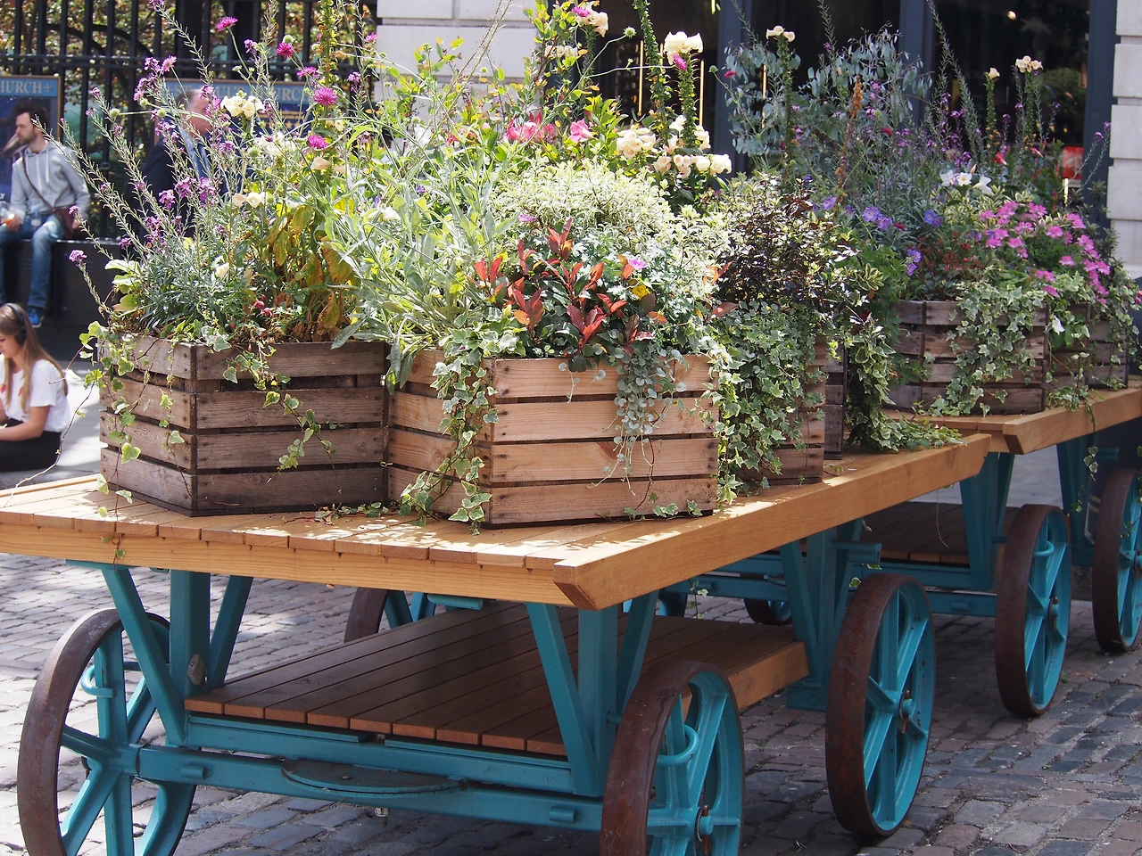 길거리 구석구석에 화려하지는 않지차만 아기자기한 꽃들로 장식된 마차 ? 위로도 환한 밝은