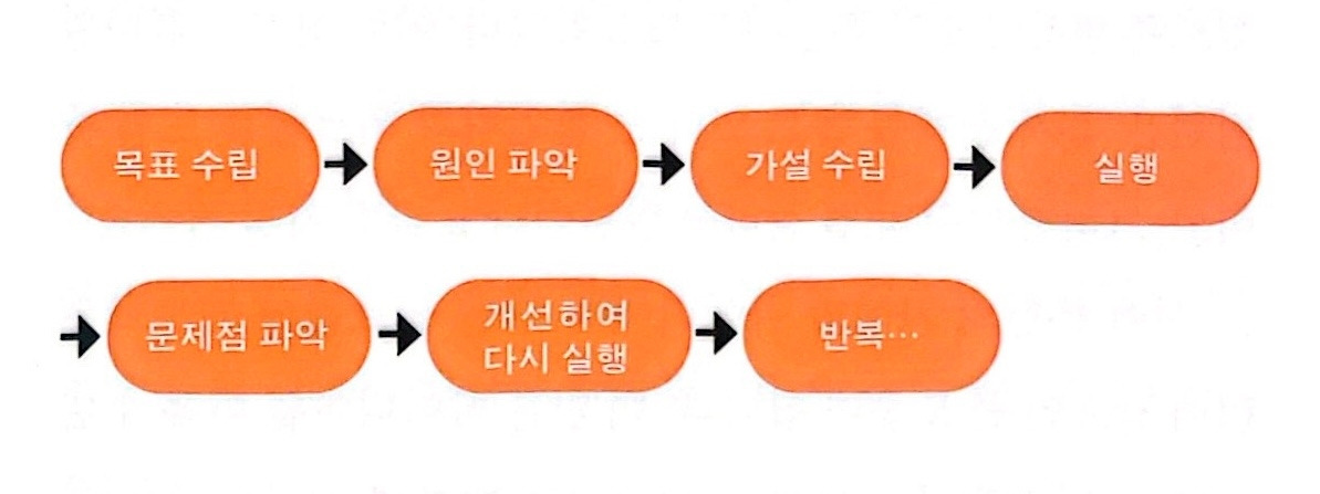 목표 수립 - 원인 파악 - 가설 수립 - 실행 - 문제점 파악 - 개선하여 다시 실행 - 반복...