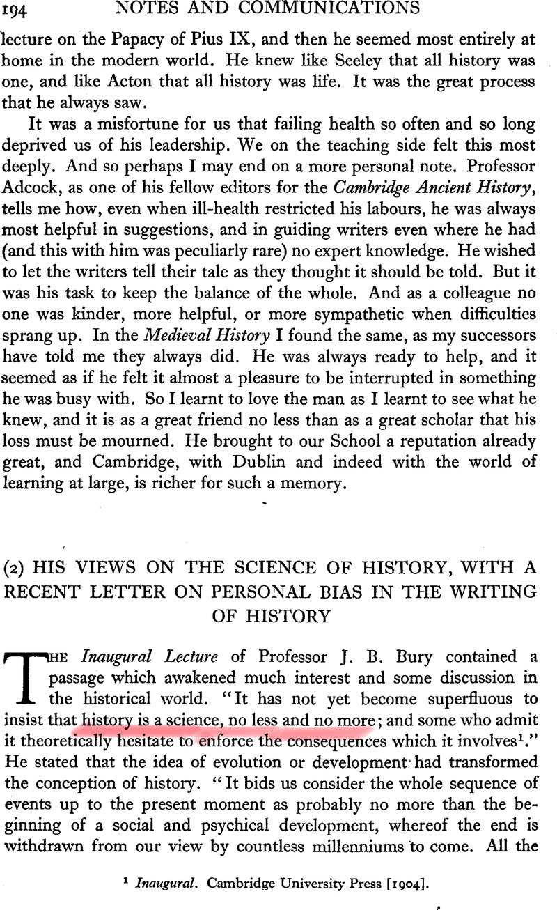 먼저 사실을 수집하고 그다음에 그것을 해석하라는 '귀납적인 역사방법‘ 역시 같은 맥락이고, 존 베리가 1903년 1월에 있었던 교수 취임강연을 마무리하면서 역사를 ‘그 이상도 그 이하도 아닌 과학(a science, no more and no less)’이라고 표현했을 때 그가 분명히 염두에 두었던 견해도 바로 이것이었다.