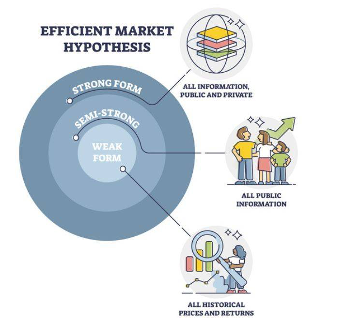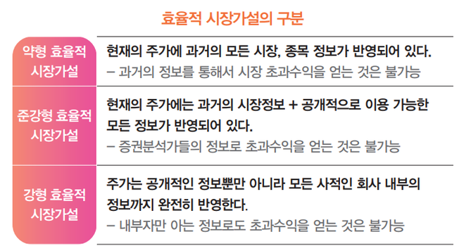 *효율적 시장가설(Efficient Market Hypothesis): 가격은 상품에 대해 "얻을 수 있는 모든 정보"(All available information)를 빠르게 반영하며 따라서 그 정보들을 이용하여 장기적으로 시장 수익률을 넘는 초과 수익을 얻을 수 없다는 가설이다. 훗날 노벨경제학상을 수상한 유진 파마가 처음 주창한 이론으로 알려져 있다.