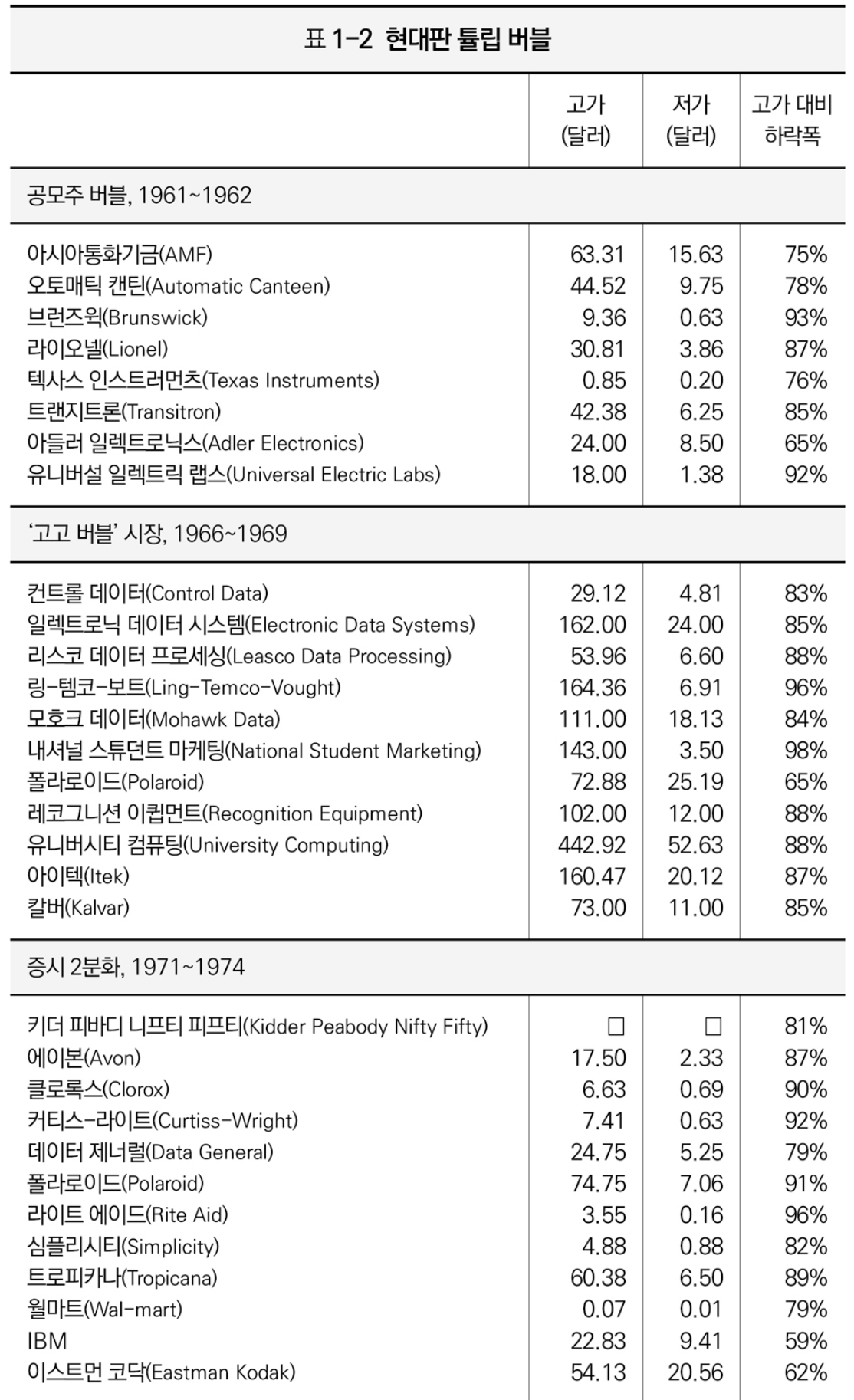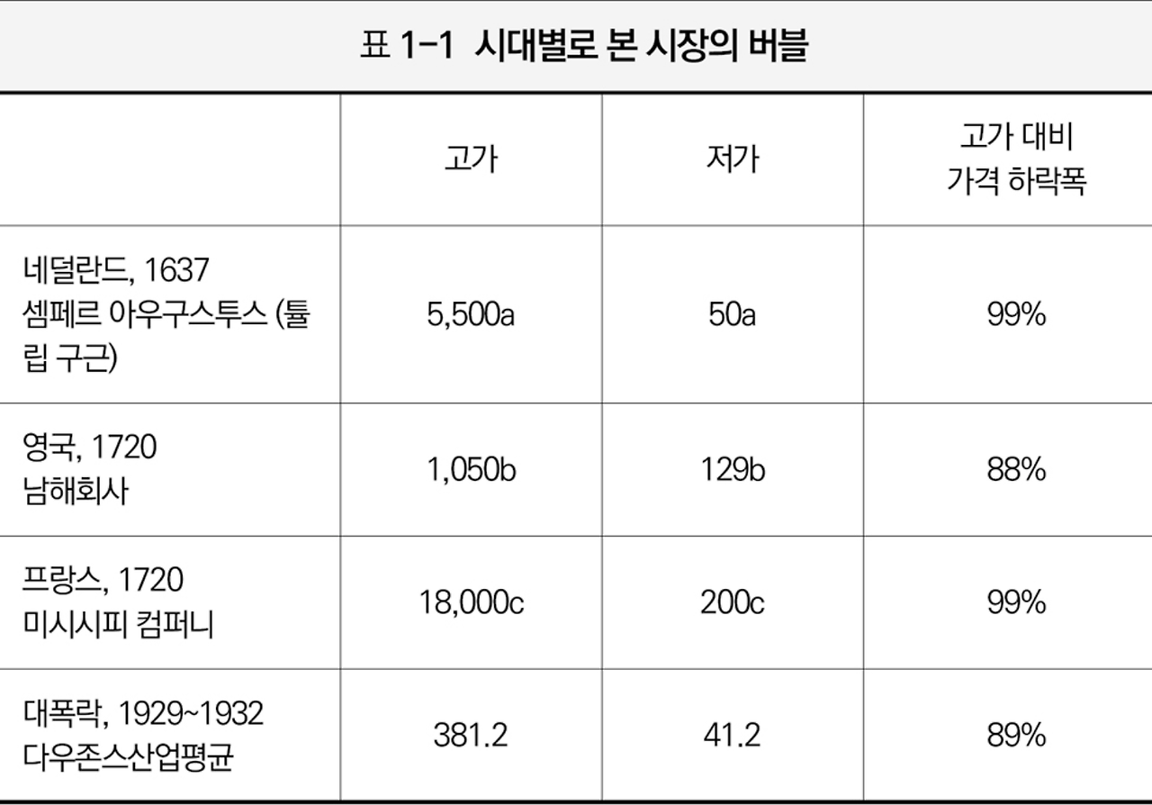 투기 광풍이 불 때마다 나타나는 가장 신기한 현상이 있다면 바로 꼭짓점에서 80~90% 이상 어마어마하게 폭락한다는 점이다. 표 1-1을 보면 시장 역사상 대표적인 네 번의 버블 사례에서 가격이 폭락하는 양상을 볼 수 있다. 바로 튤립 광풍(1637), 미시시피 컴퍼니 버블(1720), 남해회사 버블(1720) 그리고 1929년의 대폭락이다.