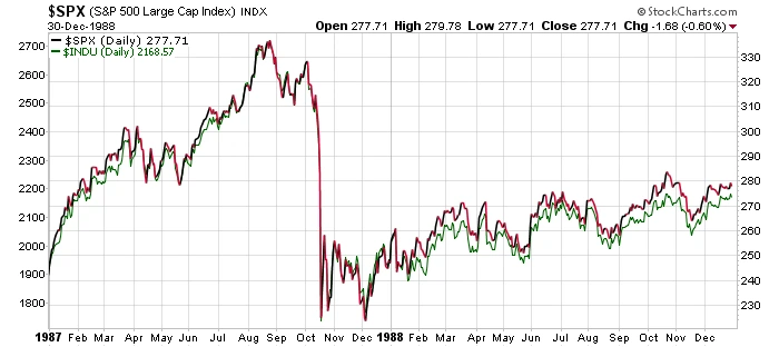 1987년 10월 블랙먼데이 주가 폭락의 시기에 언론은 ‘1929년의 재림인가’라는 헤드라인을 뽑기도 했지만, 폭락과 경기 침체는 언제나 붙어 다니는 사건은 아니며, 1988년 봄이 되어 당시 경제 환경과 투자 환경이 1929년과 완전히 딴판이라는 것이 확연히 드러났다.