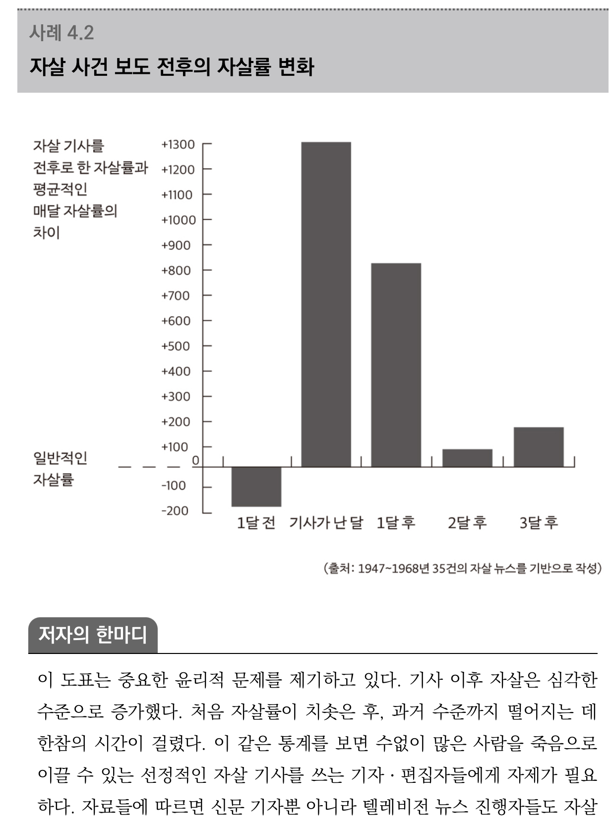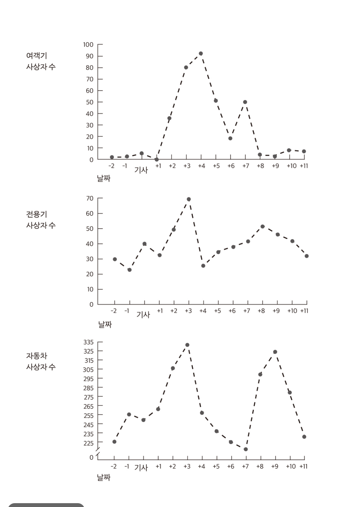 “신문 1면에 자살 사건이 보도되면 전용기나 여객기 등 비행기 추락 사고가 급증한다.”라는 통계 자료가 있다. 놀라운 사실은 자동차 사고도 급증한다는 것이다. 모종의 동일한 사회적 조건이 어떤 사람들에게는 자살 충동을, 또 어떤 사람들에게는 교통사고를 일으킨다는 것이다.