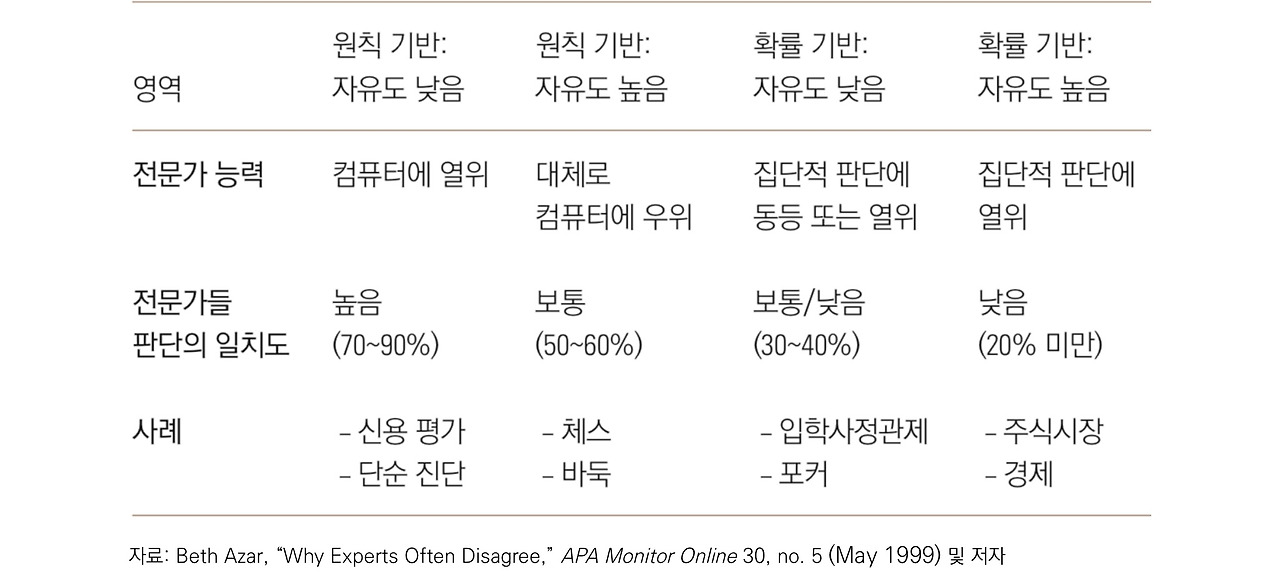 전문가가 일반인을 지속적으로 압도하는 영역이 있다. 예컨대 체스 그랜드마스터, 윔블던에서 우승한 테니스 선수, 뇌외과 전문의 등이다. 그러나 전문가 소견이 흔히 일반인 수준에도 못 미쳐서 참고할 가치가 없는 영역도 있다. 그리고 전문가 의견이 대체로 일치하는 영역도 있지만, 완전히 엇갈리는 영역도 있다. 도대체 왜 그럴까?