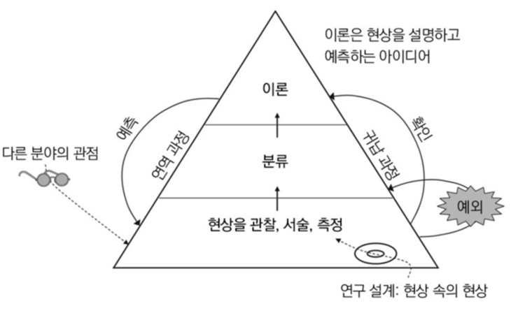 이론을 개발하면 연구자들은 다양한 상황에서 예측을 시도한다. 이 과정에서 이론에서 벗어나는 현상이나 결과를 종종 발견한다(그림 4.1의 오른쪽 참조). 예외가 나타나면 서술과 분류를 재검토한다. 그 현상을 더 정확하고 철저하게 설명해야 하기 때문이다. 예측력을 높이려면 각 단계를 돌아가면서 철저하게 점검해야 한다.