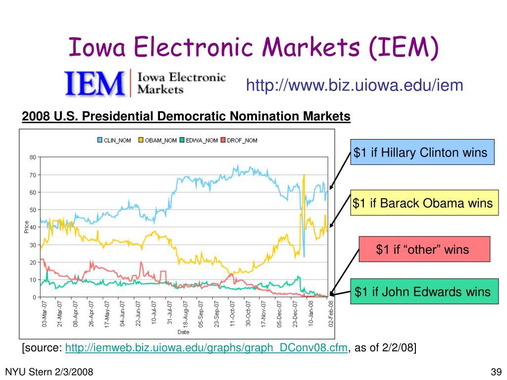 가장 잘 알려진 의사결정 시장은 1988년에 설립된 아이오와 전자시장(Iowa Electronic Markets, IEM)이다. IEM에서는 선거에 출마한 개별 후보자들의 득표율에 베팅하는 것을 허용한다. 이 시장의 기록은 부러울 정도다.