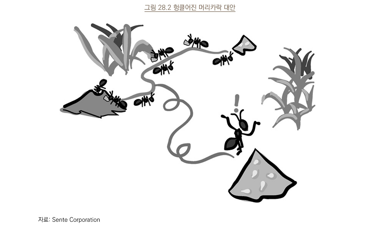 하지만 놀랍게도 자연은 이런 문제점을 예상했다. 개미들은 주기적으로 정해진 길에서 벗어나 다시 무작위적인 길 찾기 과정을 시작한다. 개미들은 이미 발견한 음식을 모으는 일과 새로운 음식을 찾는 일 사이에서 균형을 유지하도록 ‘프로그래밍' 되어 있는 것이다(그림 28.2 참조).