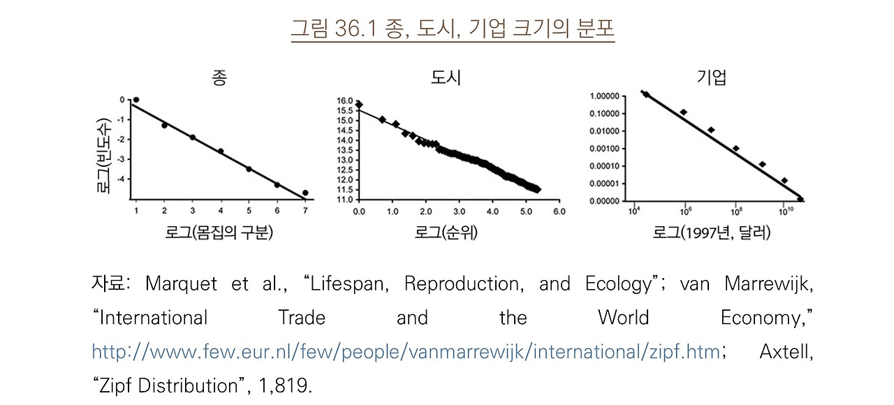 겉으로는 생물의 종(species), 도시, 기업의 크기와 빈도 분포에 공통점이 없는 듯 보인다. 하지만 이들 모두 파워 법칙을 따르고 있기 때문에 로그 스케일로 그림을 그려보면 일직선을 이룬다. 파워 법칙을 따르는 시스템은 빈도수가 높은 작은 사건들과 빈도수가 낮은 큰 사건들로 구성된다. 그림 36.1은 이런 분포를 나란히 나타낸 것이다.