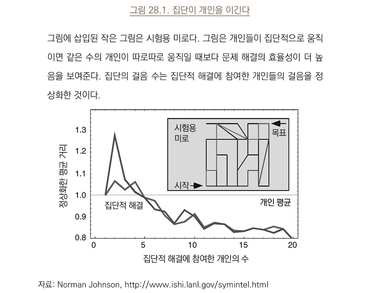 그는 먼저 미로찾기 게임에서 여러 사람이 함께 참여했을 경우 개인보다 효율성이 좋아지는 사례를 들었다. 개인의 첫 번째 미로 탐색은 무작위적이기 때문에, 개인의 집합은 경험(미로의 구역), 선호도(선호하는 통로), 해결 능력(통과 거리) 면에서 다양성을 지닌다. 따라서 집단은 강력한 정보를 지닌 개인과 같다. 이 정보의 다양성 덕분에 집단의 해결 능력은 개인의 능력보다 훨씬 더 강력해지게 된다.
