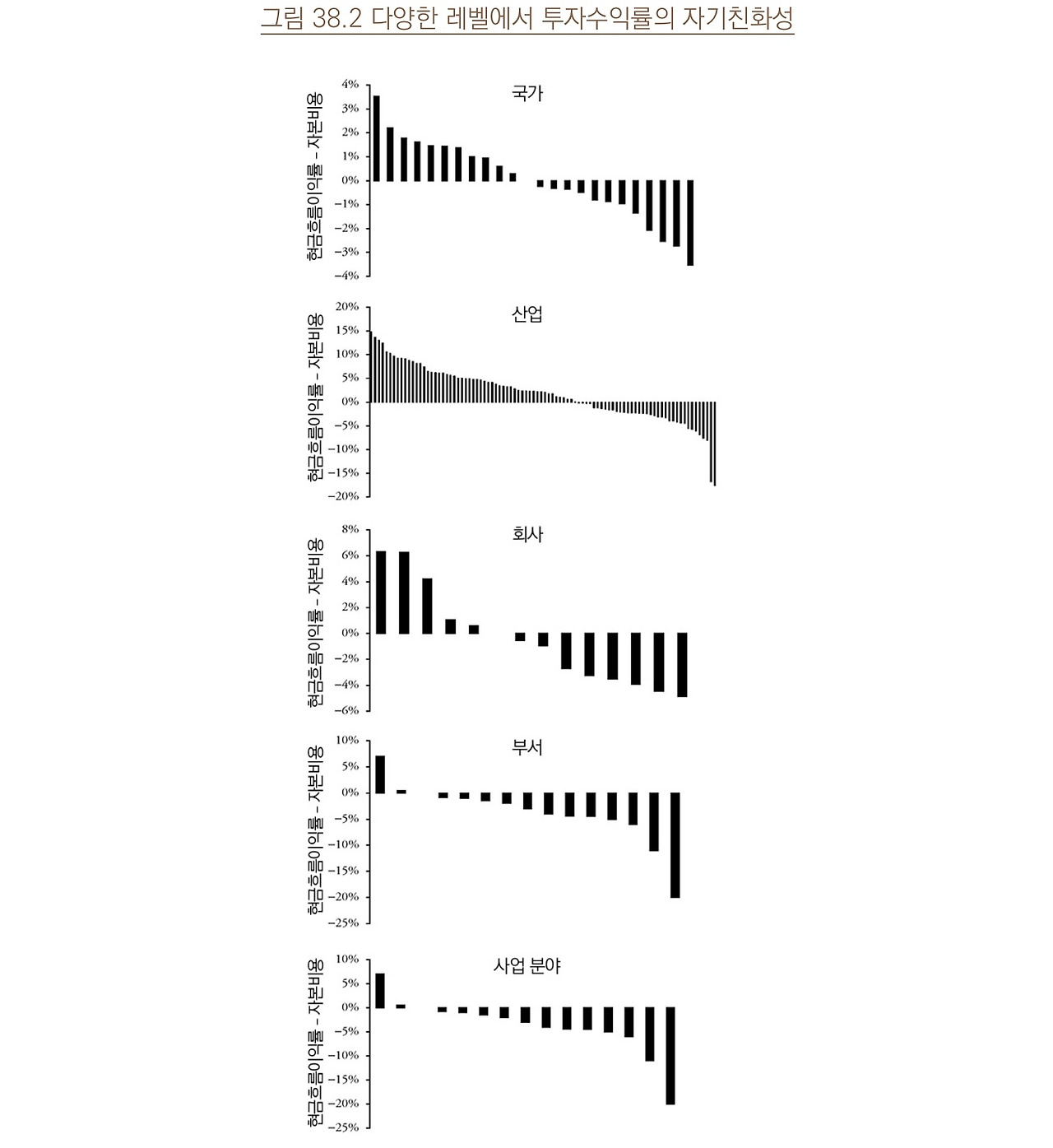 분석에 따르면, 투자수익과 자본비용 사이의 스프레드 분포는 국가, 산업, 그룹 회사, 개별 회사, 부서 등 다섯 가지 레벨에서 자기친화적인 모습을 보였다. 시각적 조사 방법으로 가장 쉽게 접근할 수 있다(그림 38.2 참조). 모든 레벨에서 가치가 창조되고 중립화되었다가 파괴되는 똑같은 양상을 띠었다.