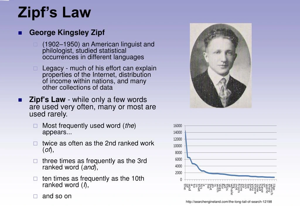하버드 대학 언어학자인 조지 지프(George K. Zipf)는 1930년대 몇몇 시스템에서 이런 관계를 찾아냈고, 그 결과를 명저 《Human Behavior and the Principle of Least Effort(인간 행동과 최소 노력의 원리)》에 정리했다.