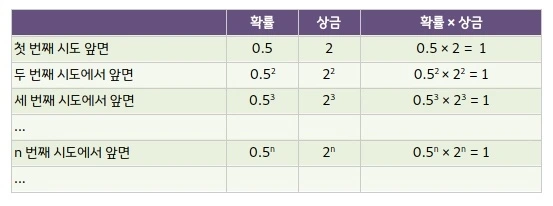 동전 한 개를 뒷면이 나올 때까지 던진다. 첫 번째에 뒷면이 나오면 2, 두 번째로 뒷면이 나오면 2의 2제곱인 4, 세 번째로 뒷면이 나오면 2의 3제곱인 8를 받는다. 마찬가지로 n번째에 뒷면이 나오면 2의 n제곱을 받는다. 이 게임을 여는 도박장은 돈이 무한히 많아 받는 돈이 얼마가 되었든지간에 정상적으로 지불이 가능하다고 가정할 때, 이런 도박장에서 처음에 얼마를 내는 것이 공정할까?
