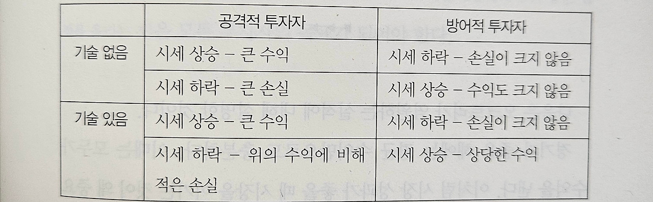 위 표의 핵심은 실적의 대칭 또는 비대칭이다. 기술이 없는 투자자들은 자신이 선택한 스타일 이상으로는 수익에 아무런 기여도 못한다. 반면에 부가가치를 창출한 기술이 있는 투자자들의 실적은 비대칭적이다. 이들이 올리는 시장 수익률은 손실률보다 높다. 기술을 가진 공격적인 투자자들은 상승 장세에서는 큰 수익을 내며, 그에 상응하는 하락 장세에서는 수익을 상쇄할 정도로 큰 손실을 입지 않는다.