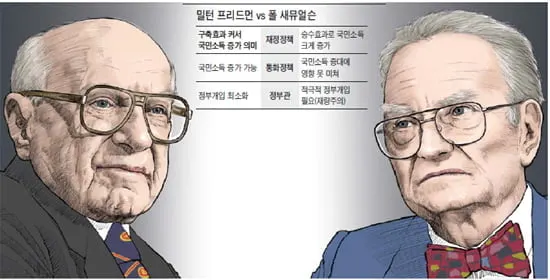 프리드먼은 “화폐가 고용과 성장에 강력한 영향을 미친다”는 것을 전제하고 논의를 시작한다. 화폐수량설이다. 화폐의 유통 속도가 일정하다는 가정에 기초한 논의이다. 반면 케인스에게 화폐수량설은 전혀 고려의 대상이 아니었다.