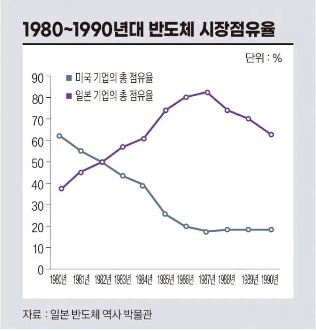 하지만 1980년대에 이르자 이런 미국의 공급망 구조에서 가장 혜택을 보는 건 일본으로 드러났고, 만약 일본이 반도체 산업을 이렇게 자연스럽게 지배할 수 있다면, 그들이 미국의 지정학적 우위를 빼앗고자 할 때 무엇으로 막을 수 있단 말인가?