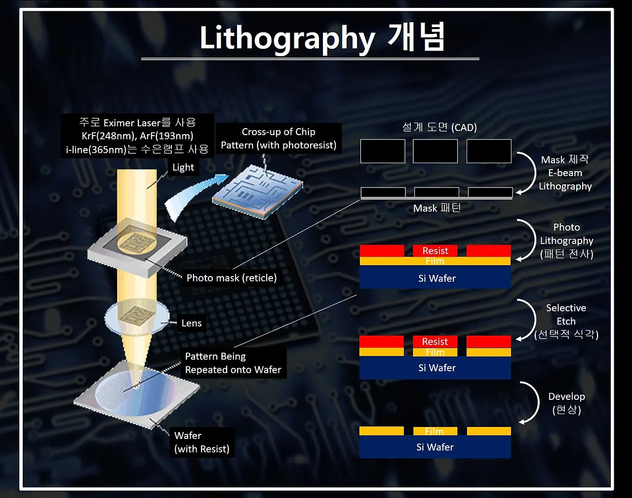 마스크와 렌즈를 통과해 비춰진 빛이 포토레지스트 화학물질로 덮인 실리콘 웨이퍼에 내리쬔다. 빛이 닿은 곳에선 화학물질이 빛과 반응하여 깎여나가 극히 미세하게 새겨진다. 새로운 물질이 이 홈들에 추가되면서 실리콘 위에 회로가 만들어진다. 특수한 화학 물질이 포토레지스트를 식각하여 완벽한 모양을 남기게 되는 것이다.