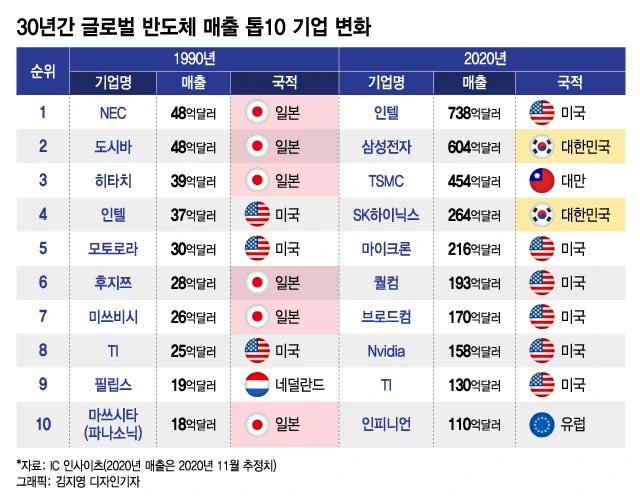 그다음 1990년의 위기가 닥쳐왔다. 일본의 금융시장이 폭락했고 경제는 깊은 불황에 빠졌다. 불과 몇 년 사이에 “1등 국가 일본”이라는 말이 더는 적절해 보이지 않았다. 일본이 침체하게 된 원인을 따져 보면 산업의 강자로 떠오르게 한 일본의 대표적 산업이 보였다. 바로 반도체였다.