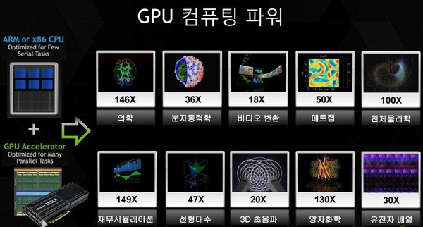 인텔이나 AMD의 CPU는 무한히 많은 용도로 사용가능하지만, 하나의 계산이 끝난 다음에야 다른 계산을 할 수 있다. 반면에 GPU는 많은 계산을 동시에 처리하도록 설계된다.