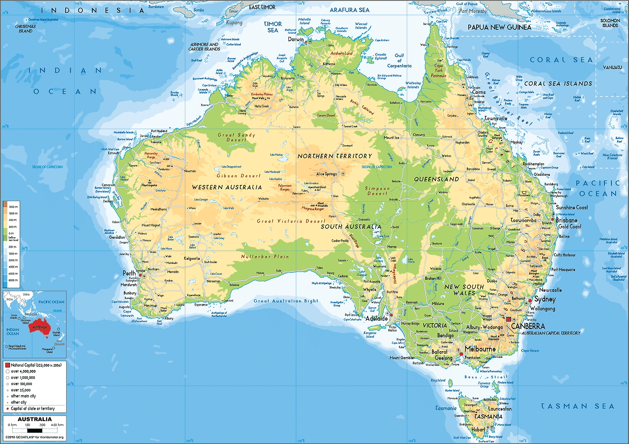 아무데도 아닌 곳의 중심에 있다 보니 브리즈번에서 태평양 너머 북동쪽을 바라보면 미국은 1만 1천5백 킬로미터, 남아메리카는 동쪽으로 1만 3천 킬로미터 떨어져 있고, 아프리카는 퍼스에서 서쪽으로 인도양을 8천 킬로미터나 건너야 도달한다.