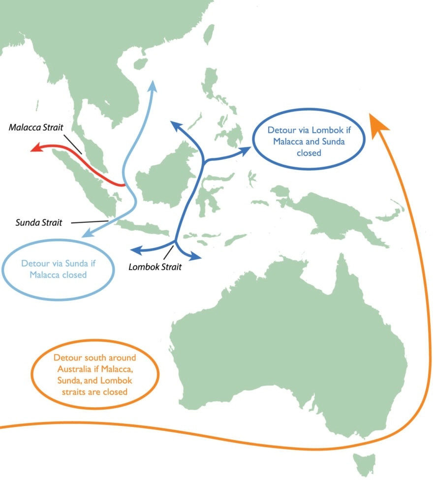 그런데 이 나라가 봉쇄와 차단에 속수무책이 될 경우가 있다. 대부분의 수출입 상품들이 북쪽의 해협들을 통해 드나들고 있는데 혹시 분쟁이라도 벌어진다면 그곳이 봉쇄돼 버릴 수 있기 때문이다. 말라카 해협, 순다 해협, 롬복 해협이 여기에 해당한다. 만약 이들 해협에 대한 봉쇄가 성공적으로 이뤄진다면 오스트레일리아도 순식간에 에너지 위기에 처할 수 있다.