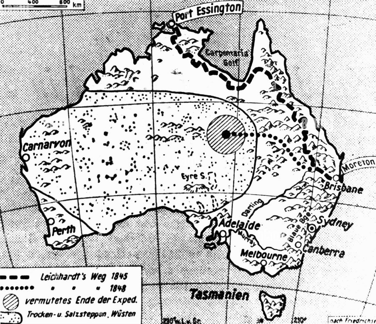 1848년에는 독일의 지리학자이자 탐험가인 루드비히 라이히하르트(1813~1848)가 이끄는 탐사팀이 대륙의 동쪽 끝(브리즈번)에서 서쪽 끝(퍼스)까지 내륙으로 횡단을 시도하다가(1845년에는 브리즈번에서 북쪽 포트에싱턴까지 탐사 성공) 실종되기도 했다. 오늘날에도 그의 자취를 찾는 시도가 이어지고 있다.