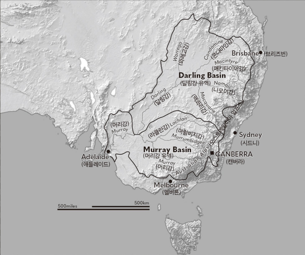 그중 일부 구간은 선박도 다닐 수 있어서 머리-달링 강은 이 나라에게는 왕관에 박힌 보석과도 같은 존재이기도 하다. 머리-달링 수계는 여러 세대에 걸쳐 이곳 사람들을 먹여 살리고 물을 대어준 비옥한 땅을 품고 있다. 그것이 없었다면 초기 정착민들은 아예 해안지대를 벗어나는 건 꿈도 못 꾸었을 것이다.